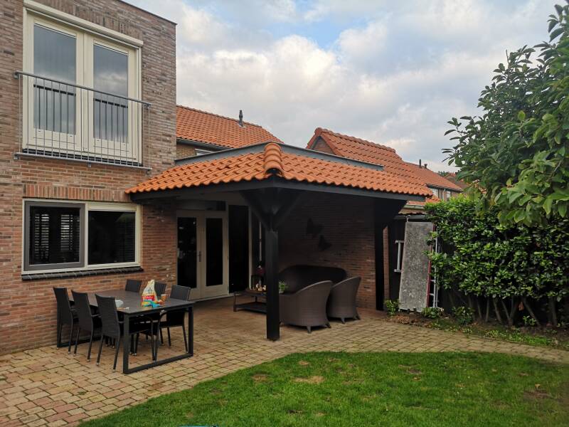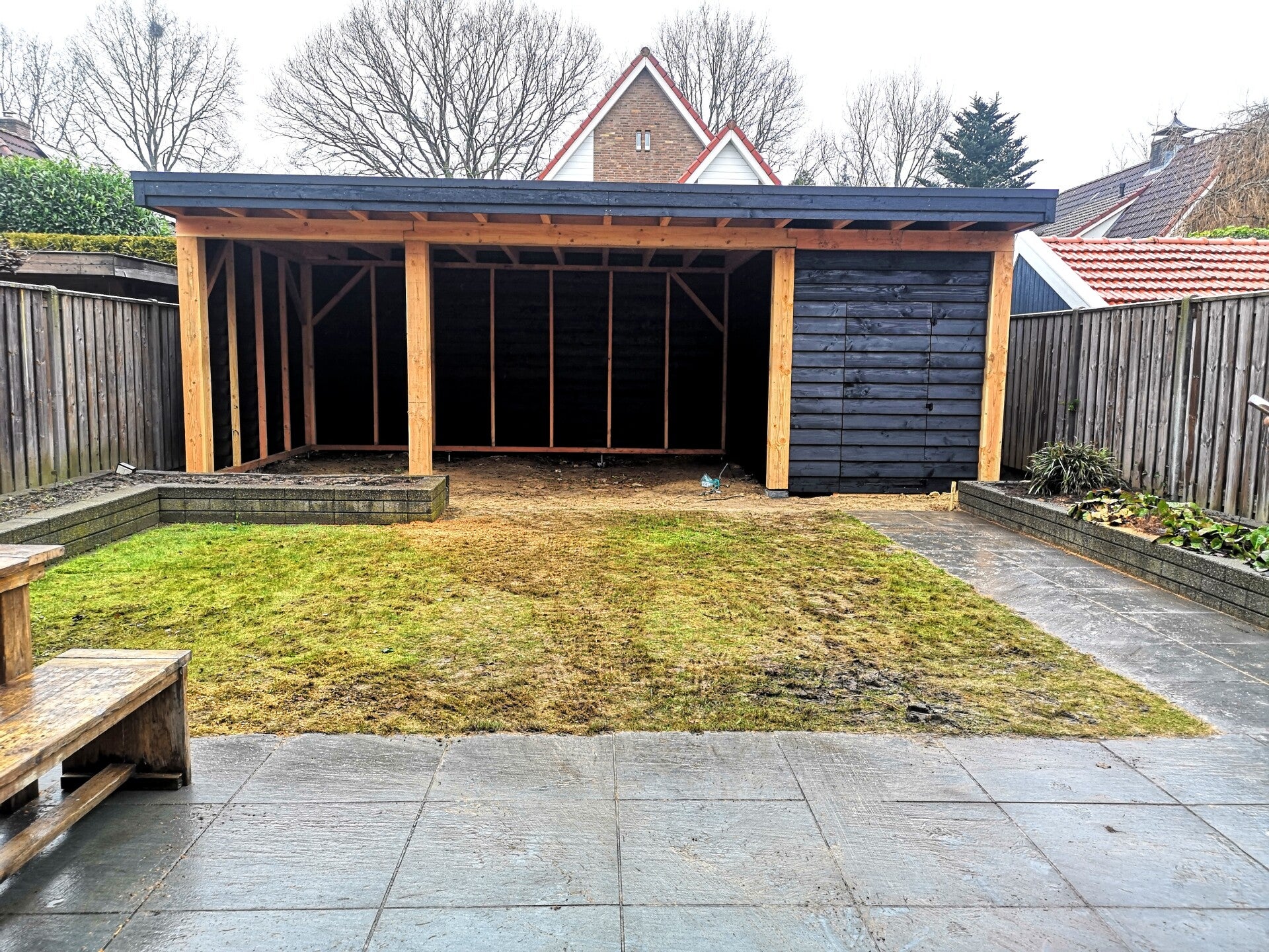 voorzien van robuuste 20x20 Douglas palen en zwart gespoten potdeksel planken. overkapping wordt aan de linker kant nog voorzien van draaibare lamellen.
